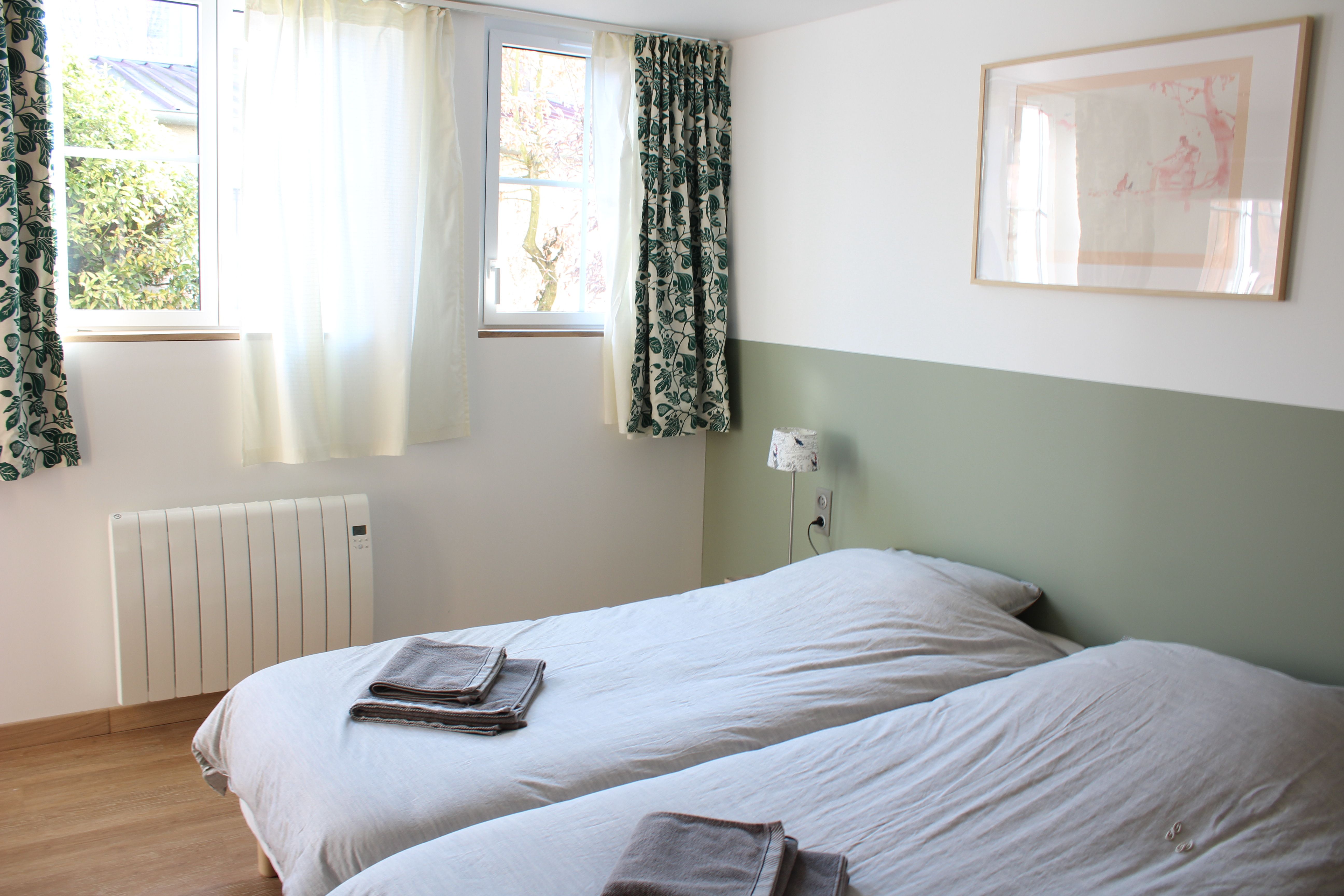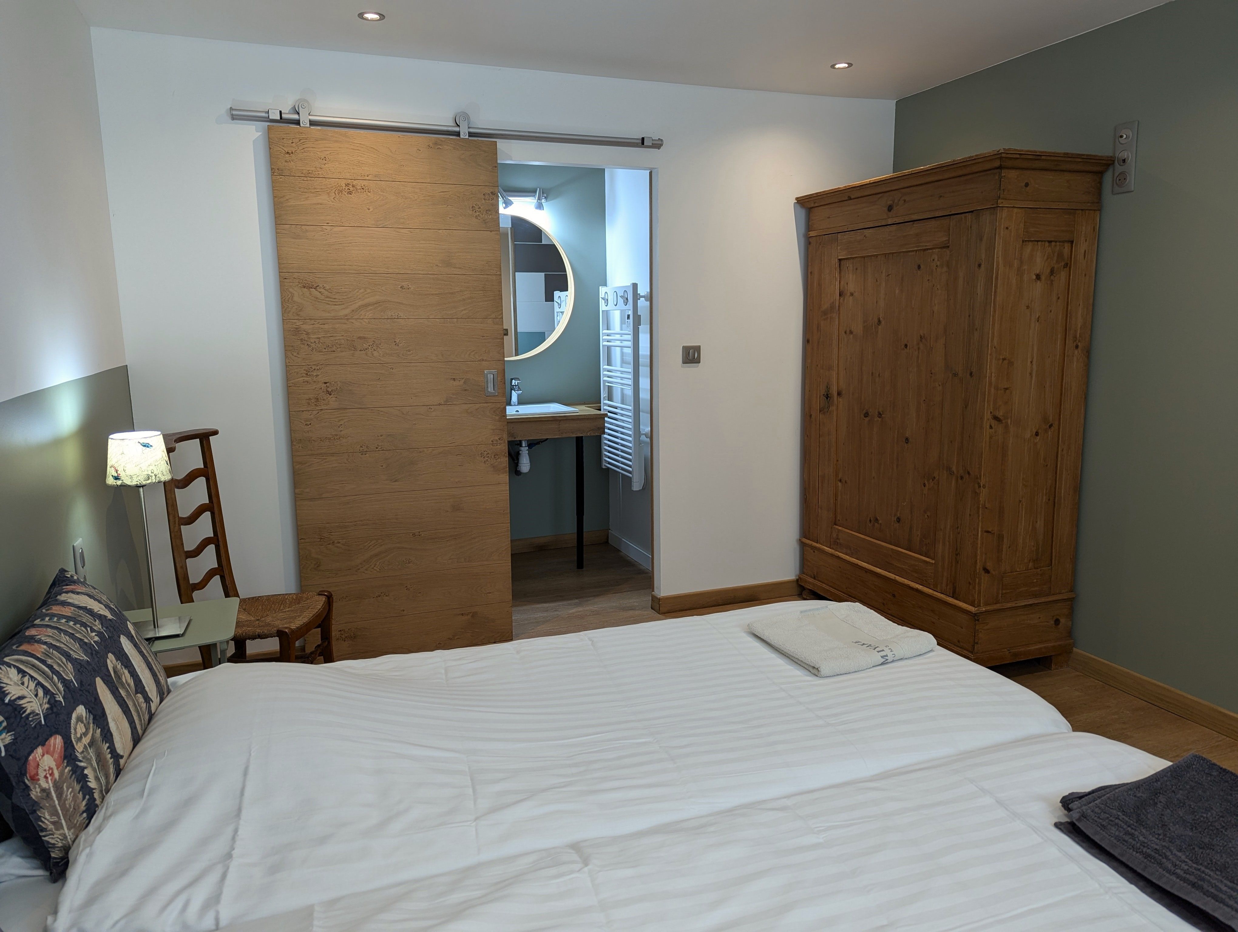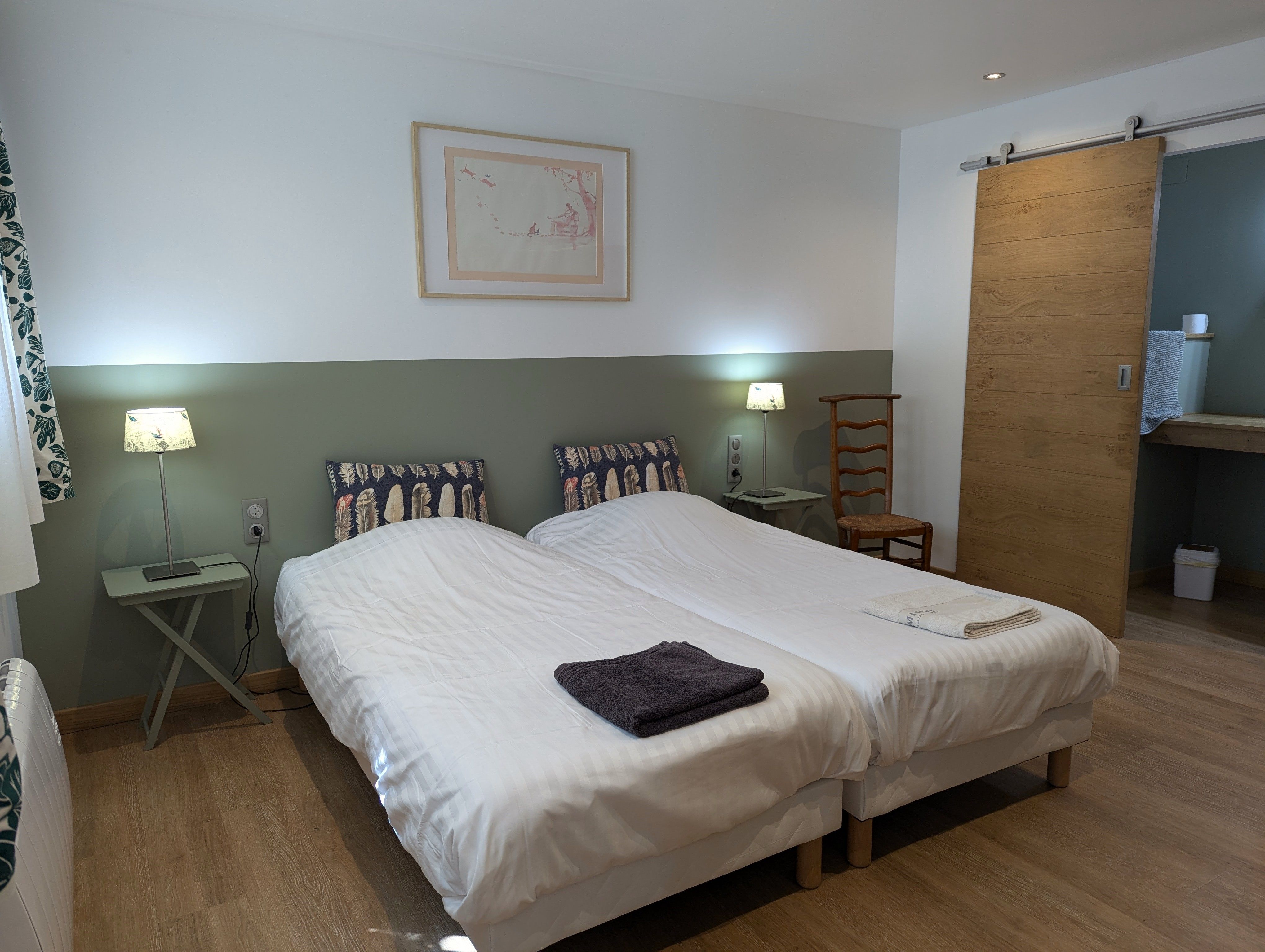 Tout en rez-de-chaussée avec pièce de vie de 17 m², cuisine ouverte moderne avec table à manger donnant sur un confortable salon avec TV (canapé-lit de 140). Chambre avec 2 lits de 90×200 (configuration en lit double de 180 possible). Salle d’eau attenante à la chambre avec douche, meuble vasque et wc.