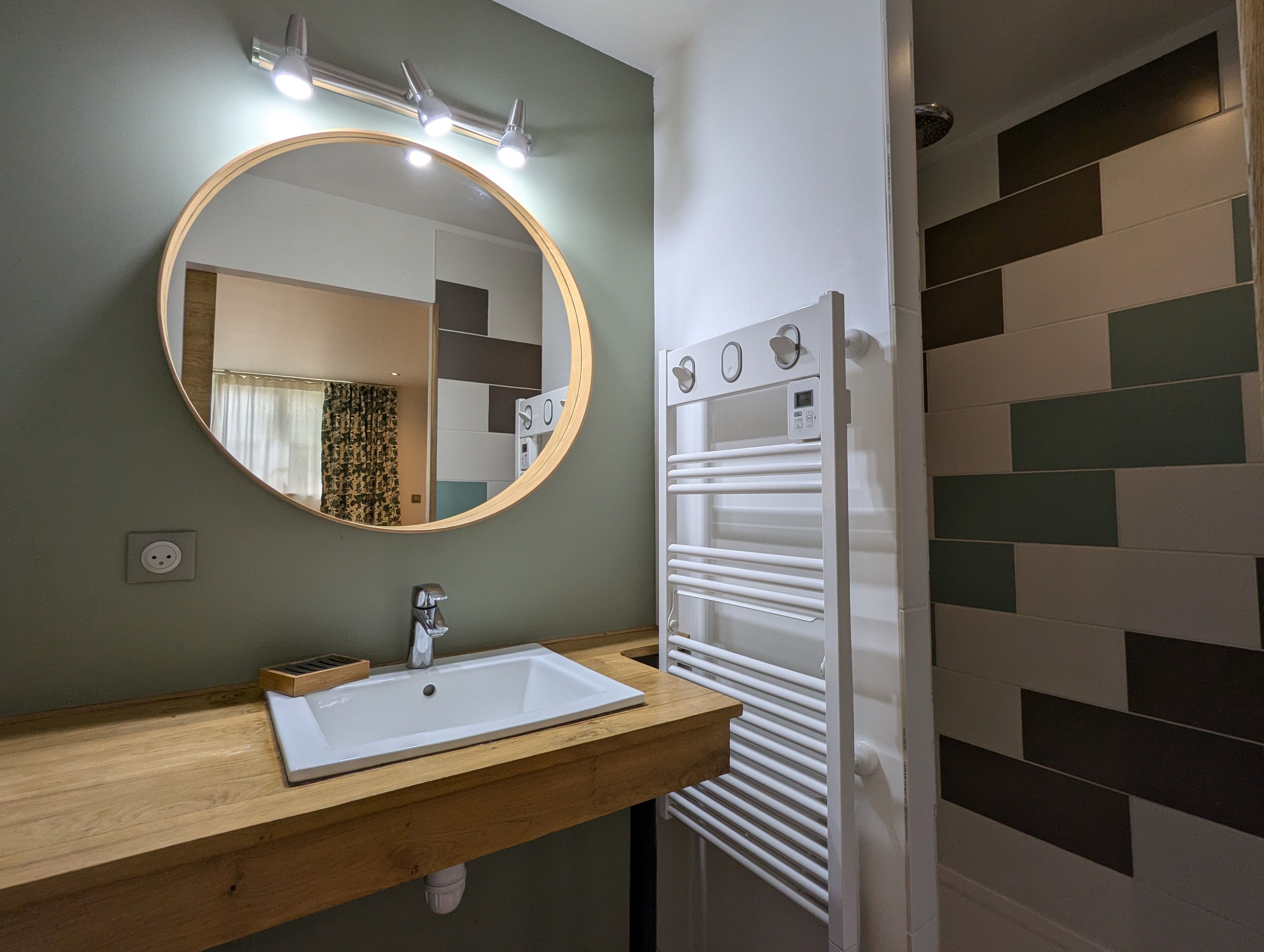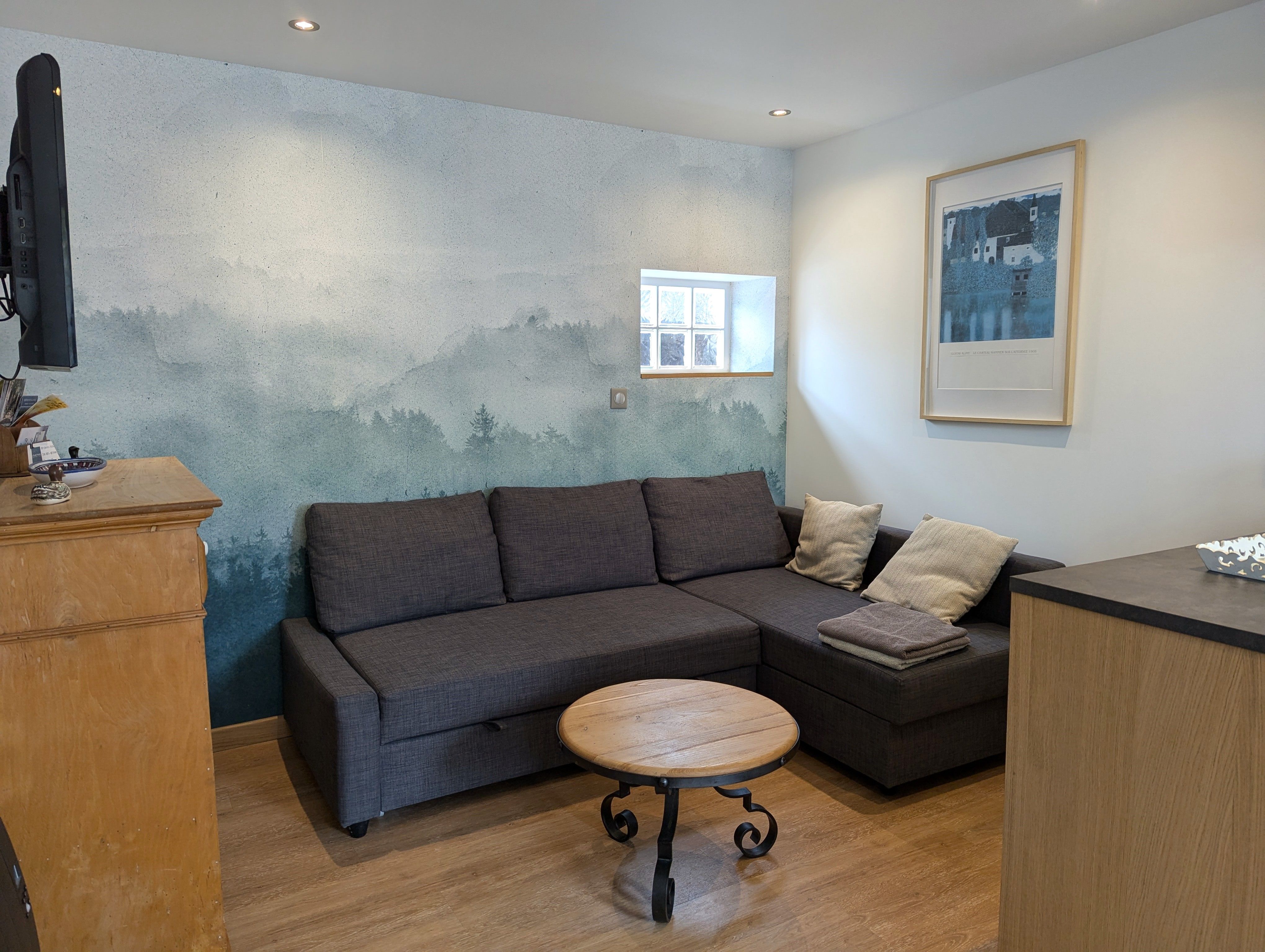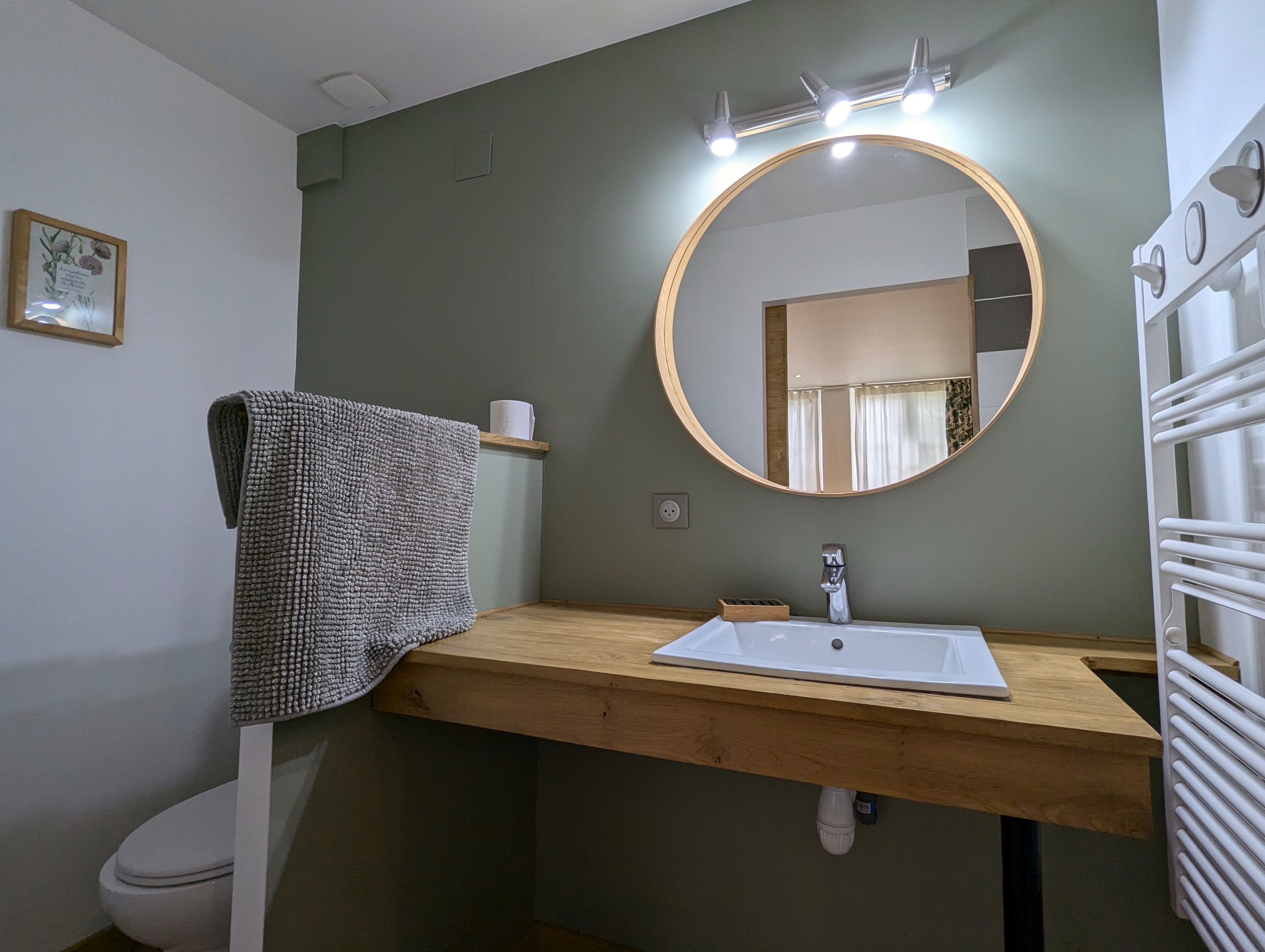 Tout en rez-de-chaussée avec pièce de vie de 17 m², cuisine ouverte moderne avec table à manger donnant sur un confortable salon avec TV (canapé-lit de 140). Chambre avec 2 lits de 90×200 (configuration en lit double de 180 possible). Salle d’eau attenante à la chambre avec douche, meuble vasque et wc.