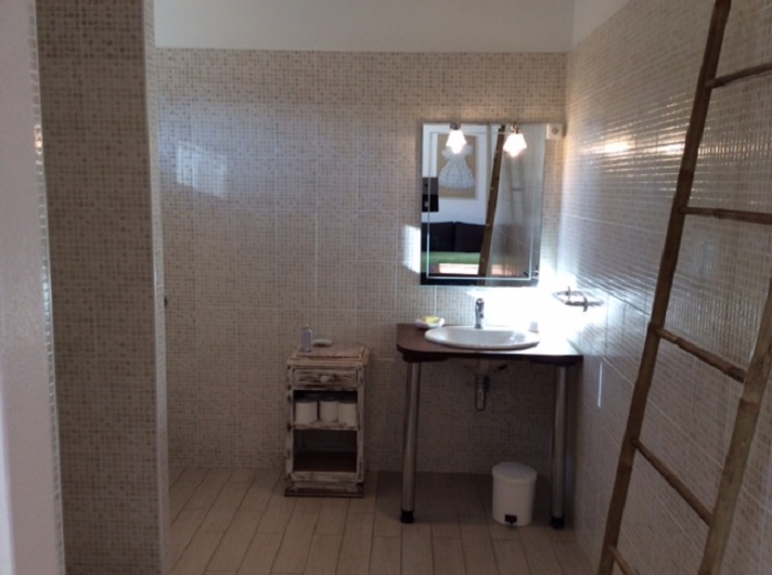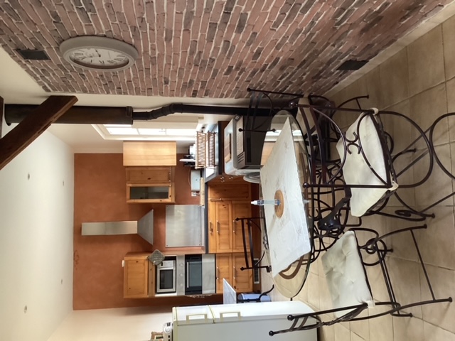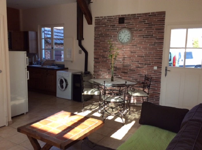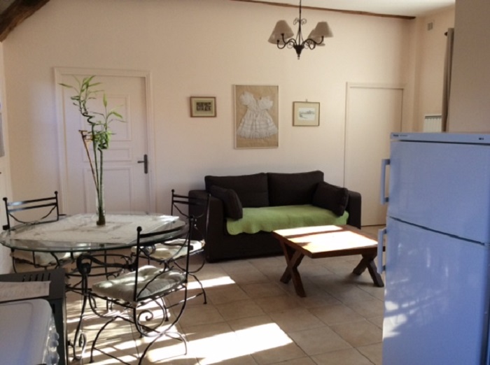 Séjour avec cuisine à l’américaine de 25m² : canapé lit en 140, télévision, lave-linge.