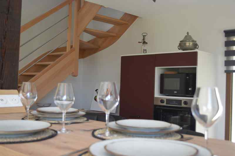L’hébergement, totalement indépendant, comprend une grande pièce à vivre de 45 m² composée d’une cuisine contemporaine équipée, d’un salon avec cheminée traditionnelle et TV, donnant sur une terrasse de 40 m² (avec patio couvert, salon de jardin et barbecue) et vue sur les bois et les étangs.
