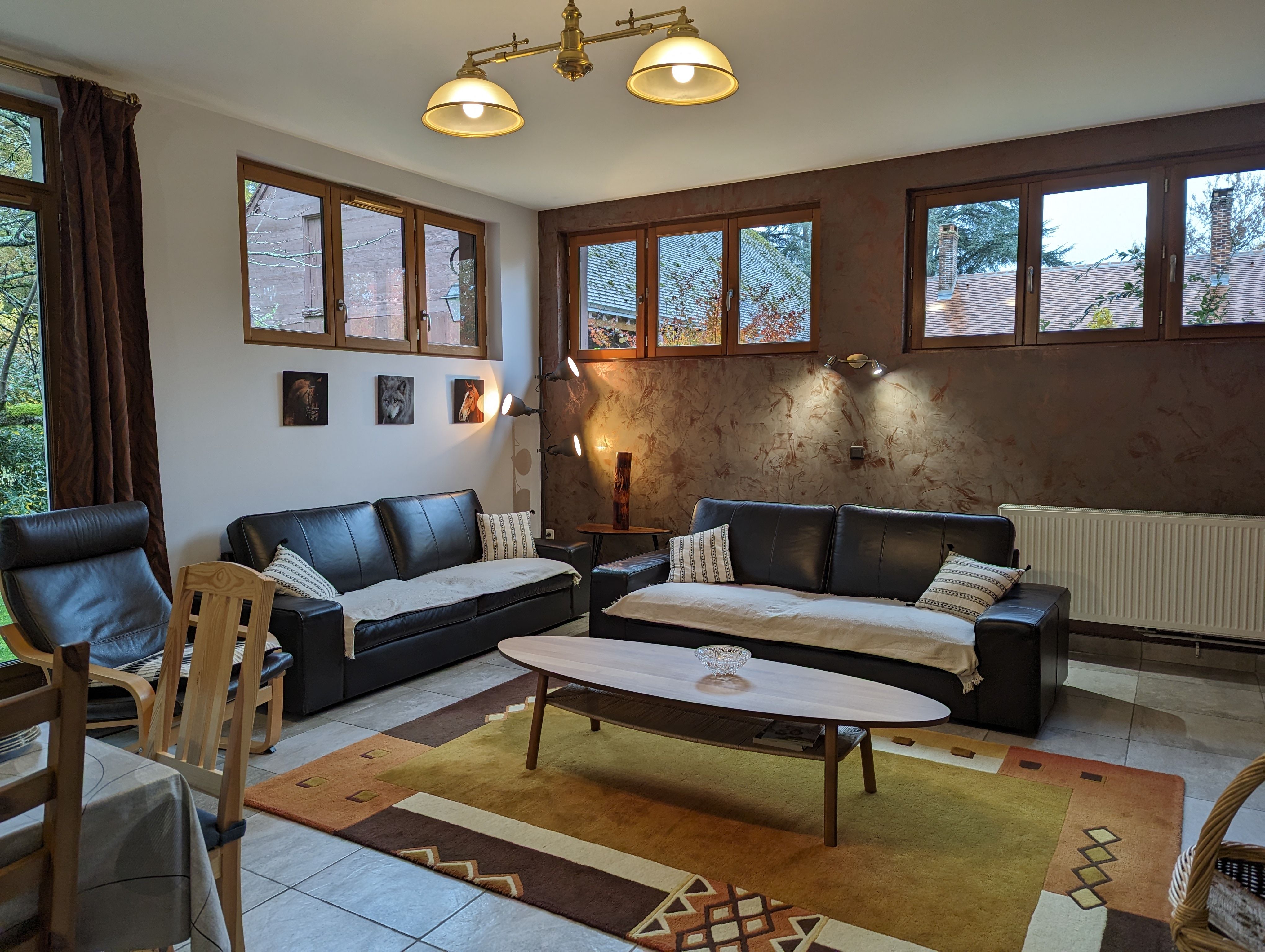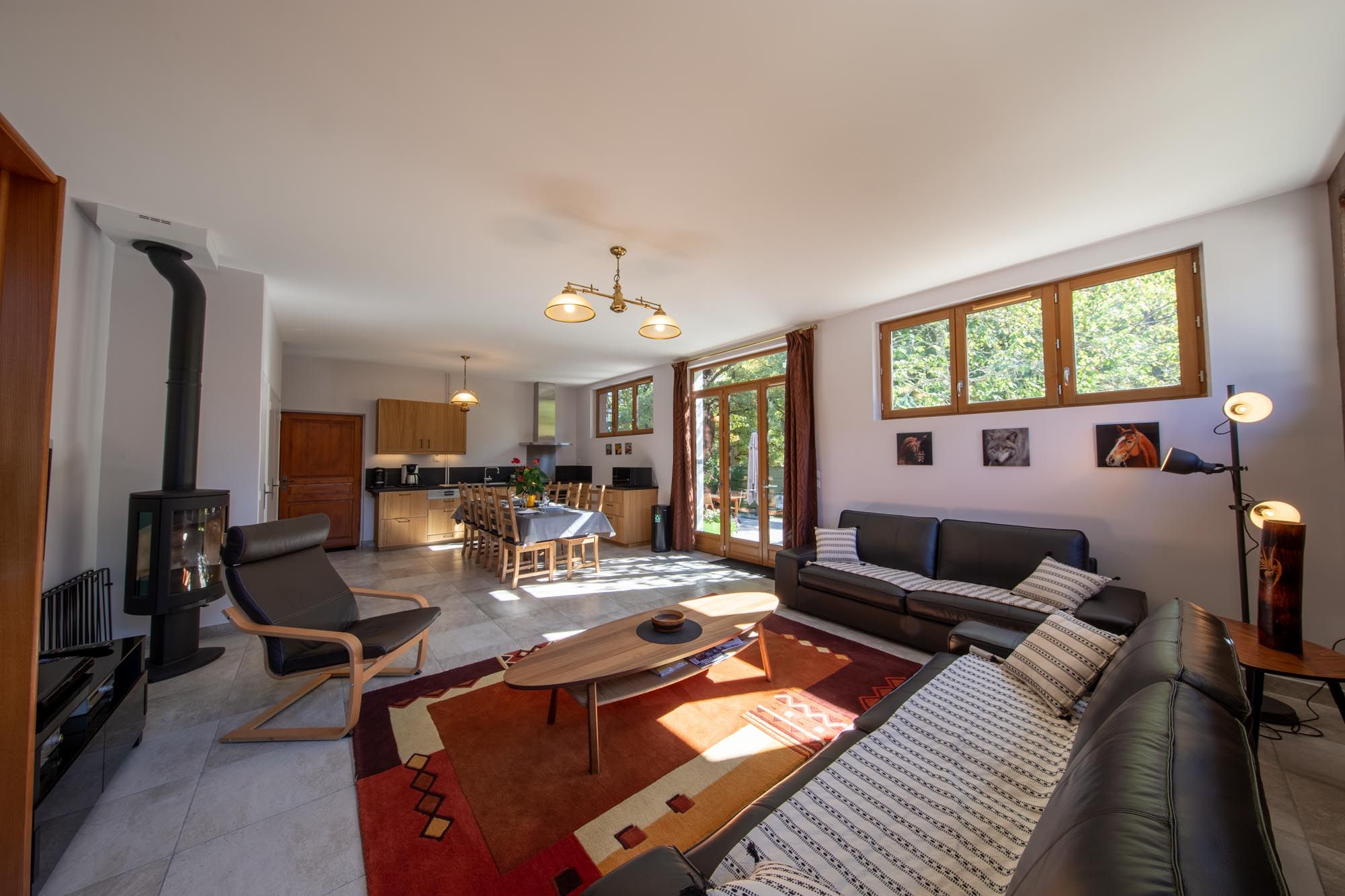 Séjour salon avec grand meuble, canapés, TV écran plat, poêle à bois design. Pièce très claire avec une grande porte fenêtre donnant au sud sur le jardin et la terrasse.