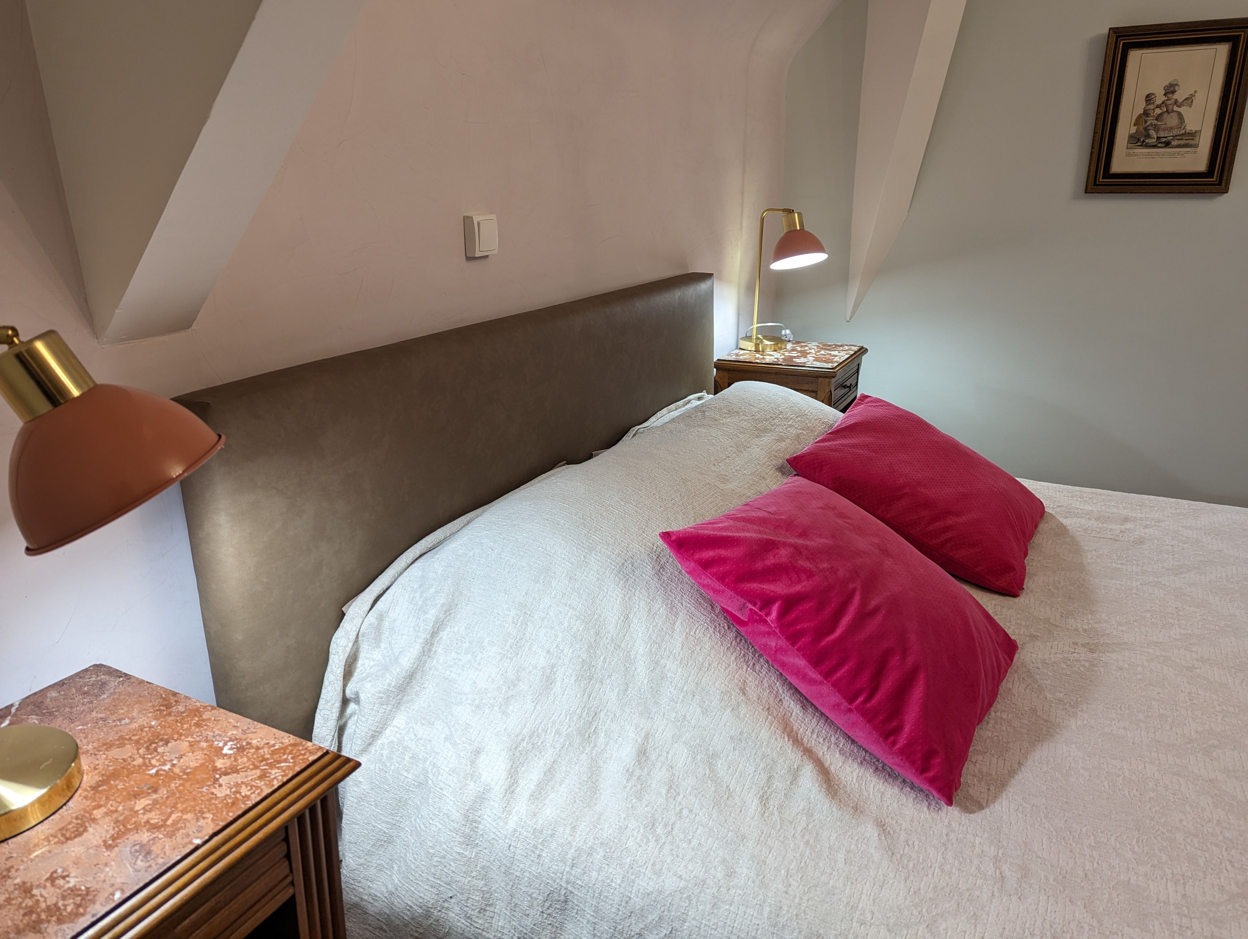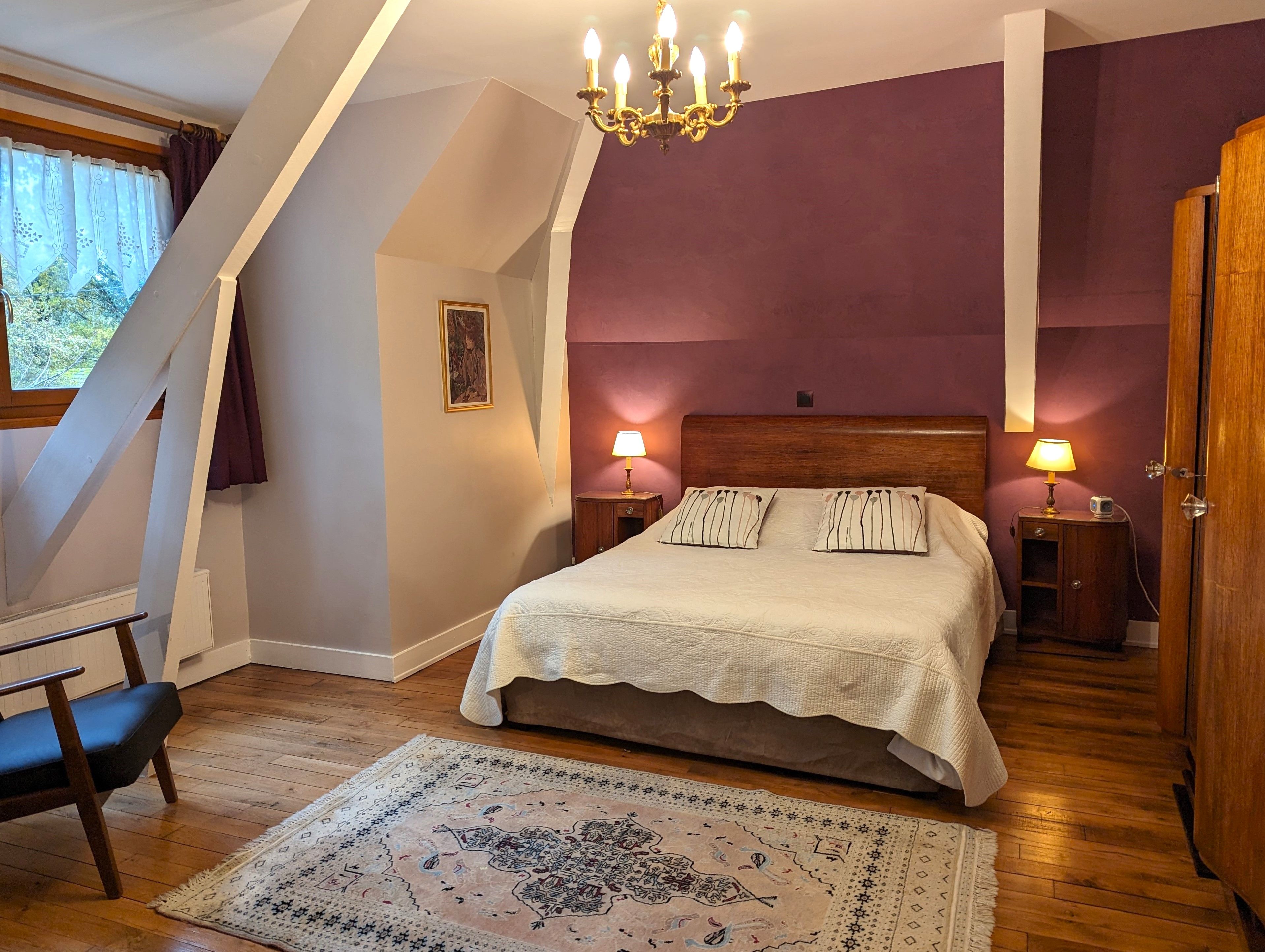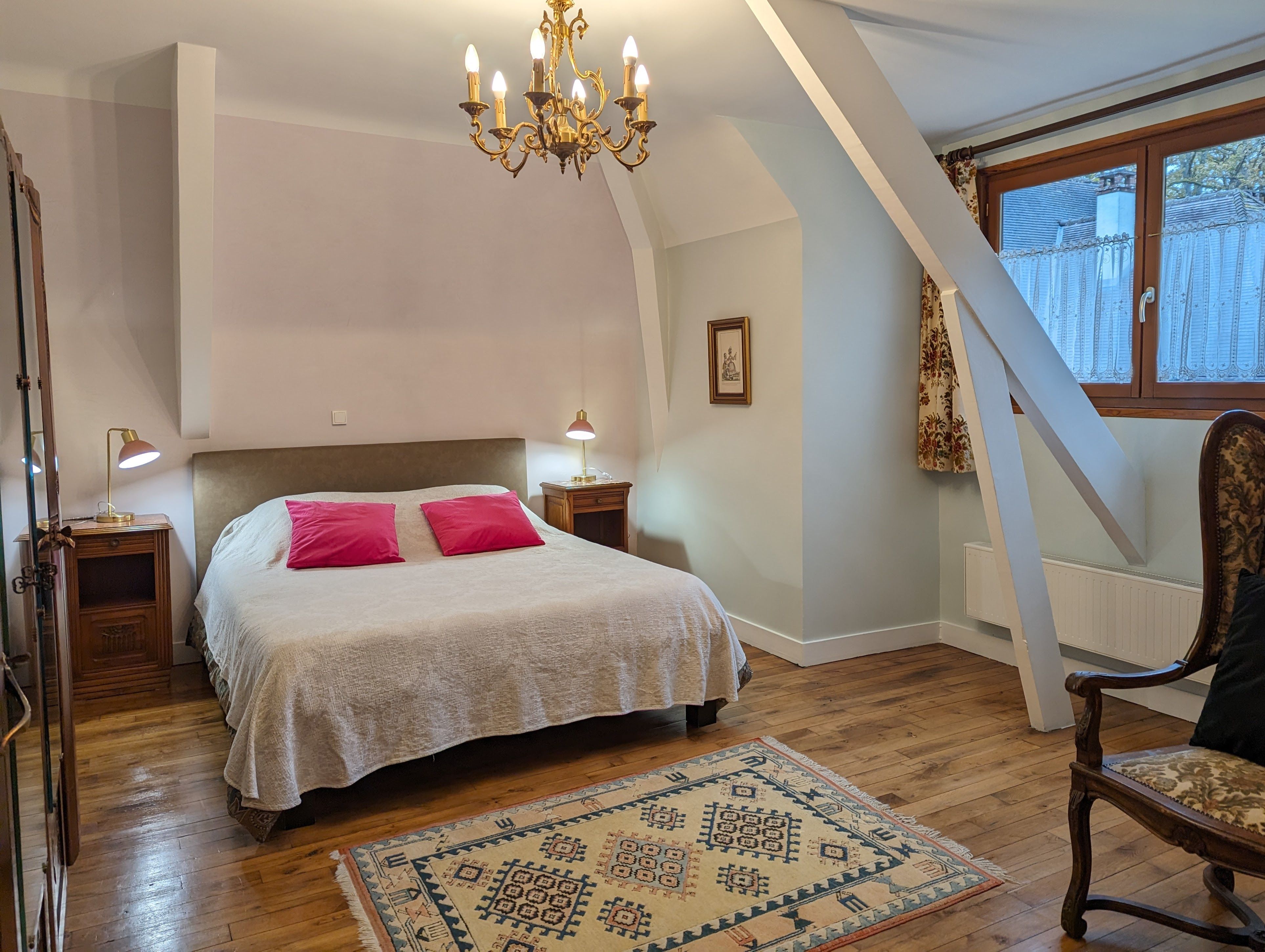 – Chambre n°1 (24,54 m² – au nord) : Un lit de 160×200, vue sur parc, forêt et chemin. Salle d’eau attenante avec douche italienne (3,61 m²) + wc séparé (1,63 m²).