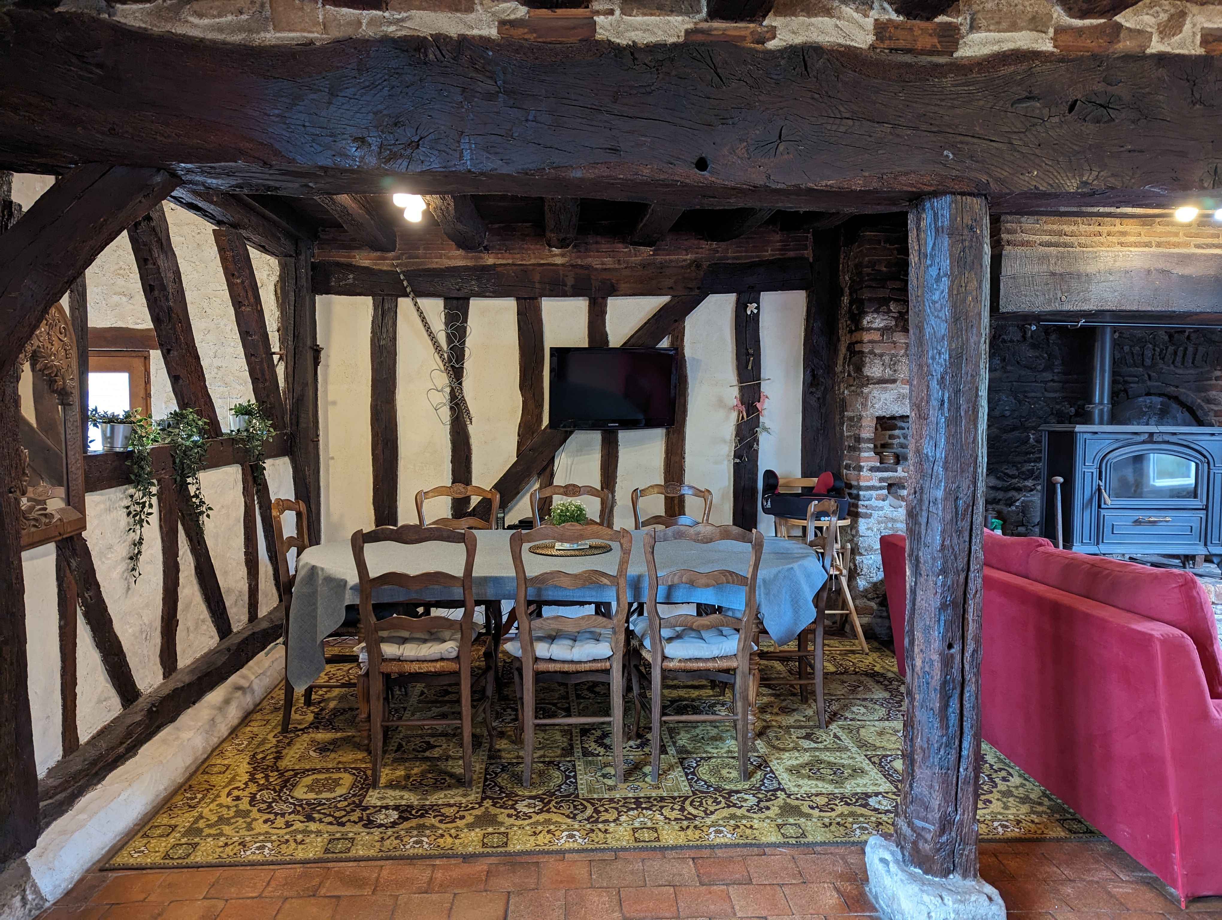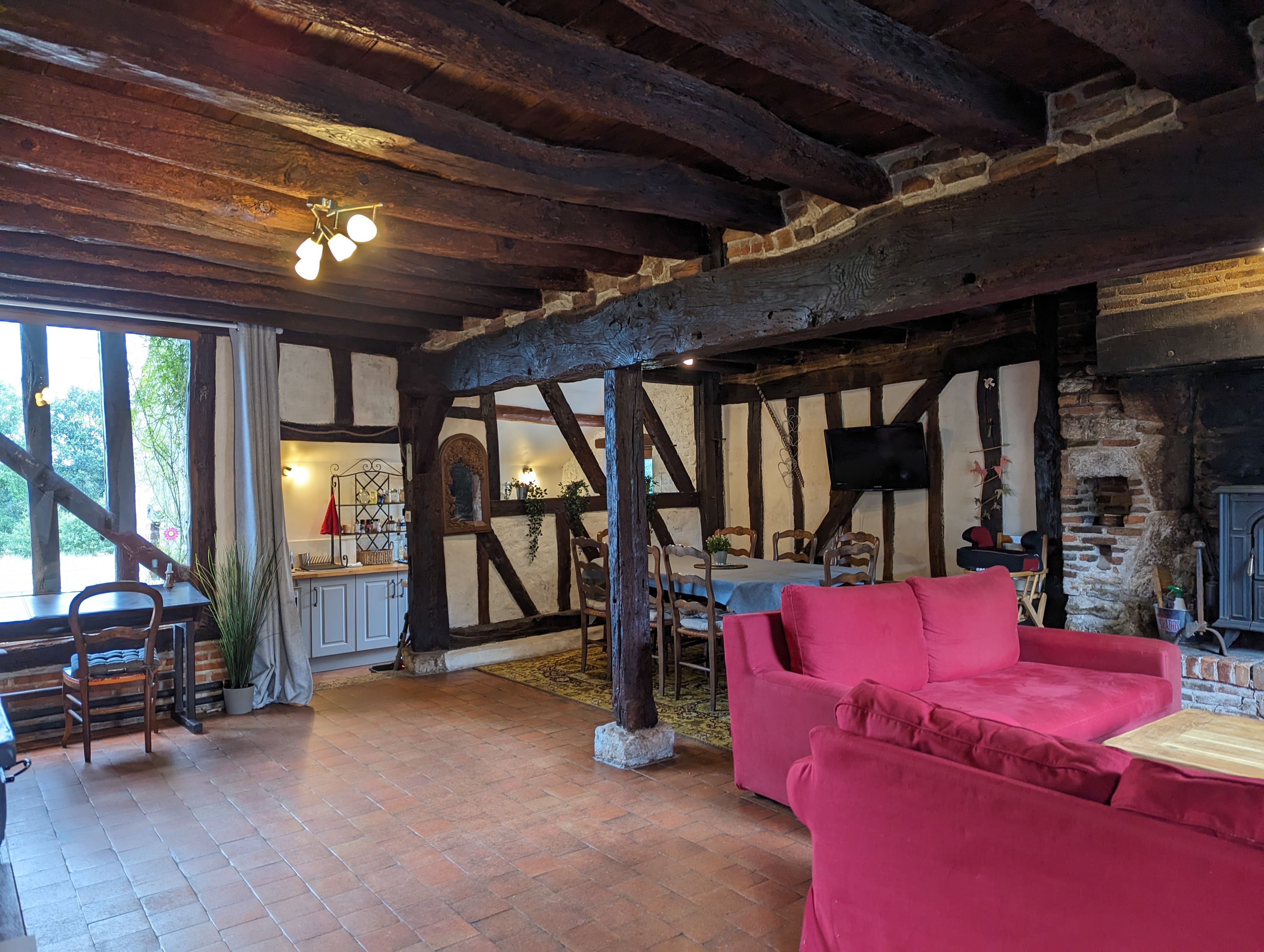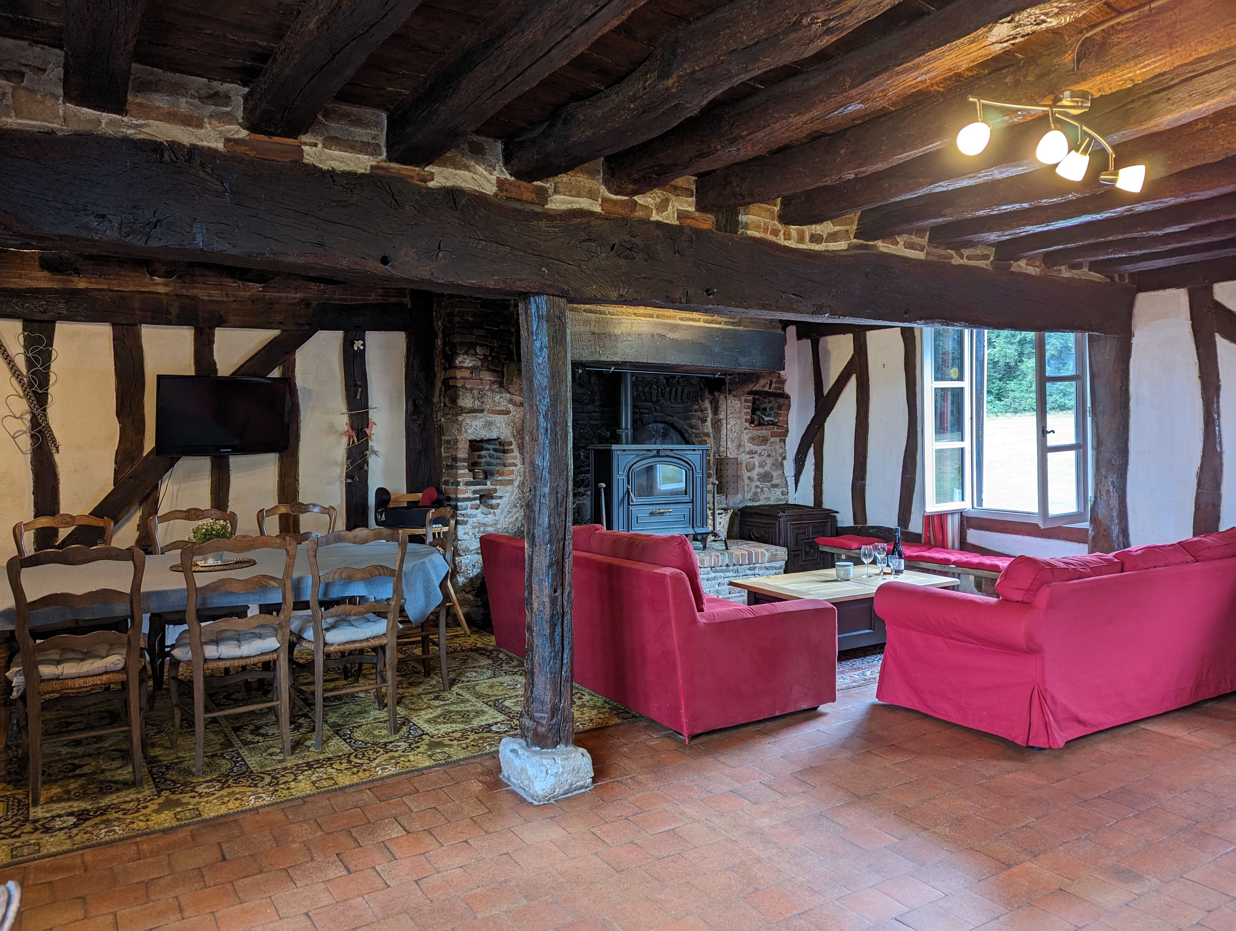 – Une grande pièce à vivre avec espace salon et son poêle à bois, salle à manger et cuisine toute équipée ouverte (Réfrigérateur avec petit compartiment congélateur, plaque de cuisson gaz (4 feux), four, micro-ondes, lave-vaisselle, lave-linge, sèche-linge). Le salon vous offrira des soirées au coin du feu.