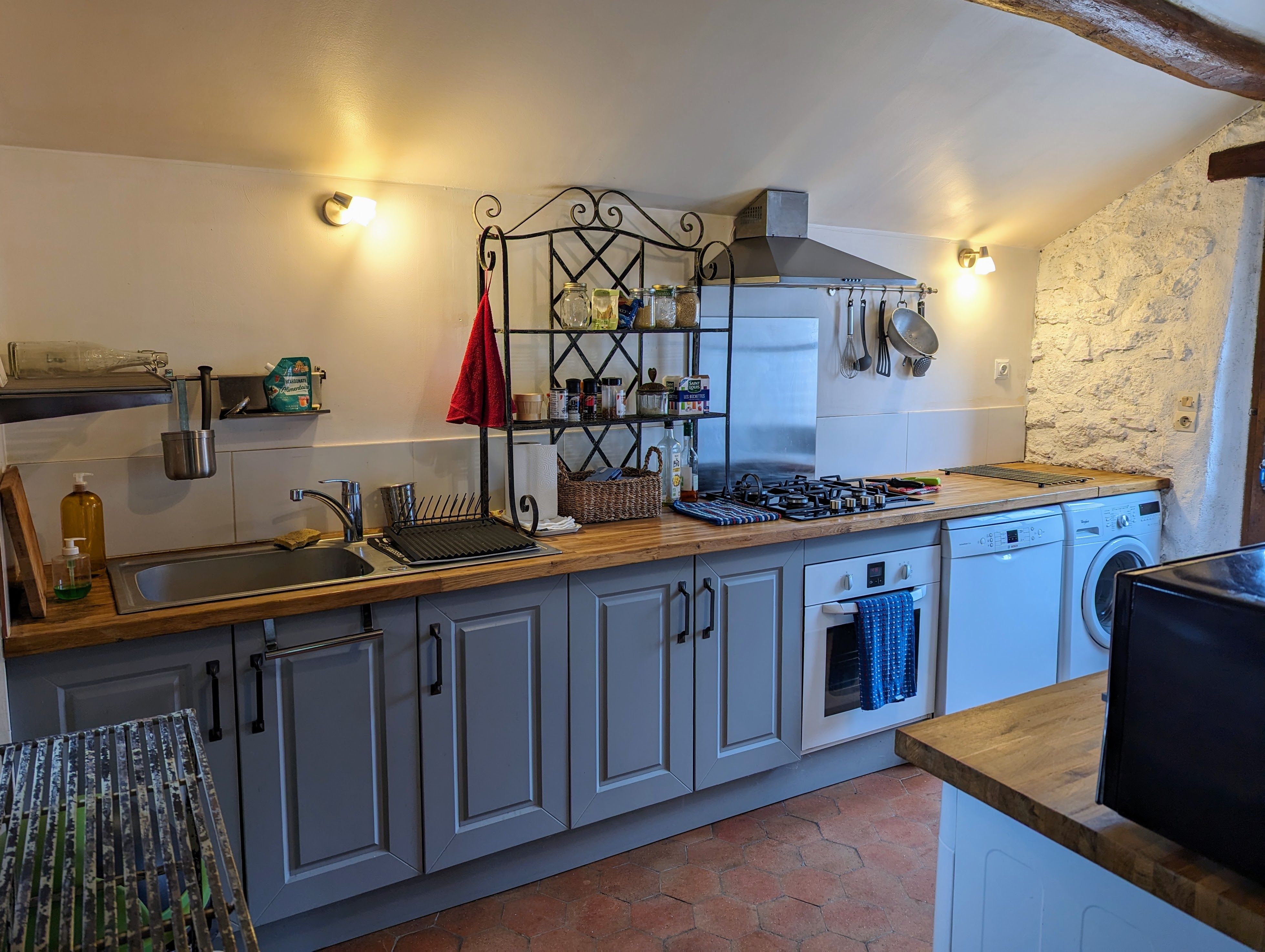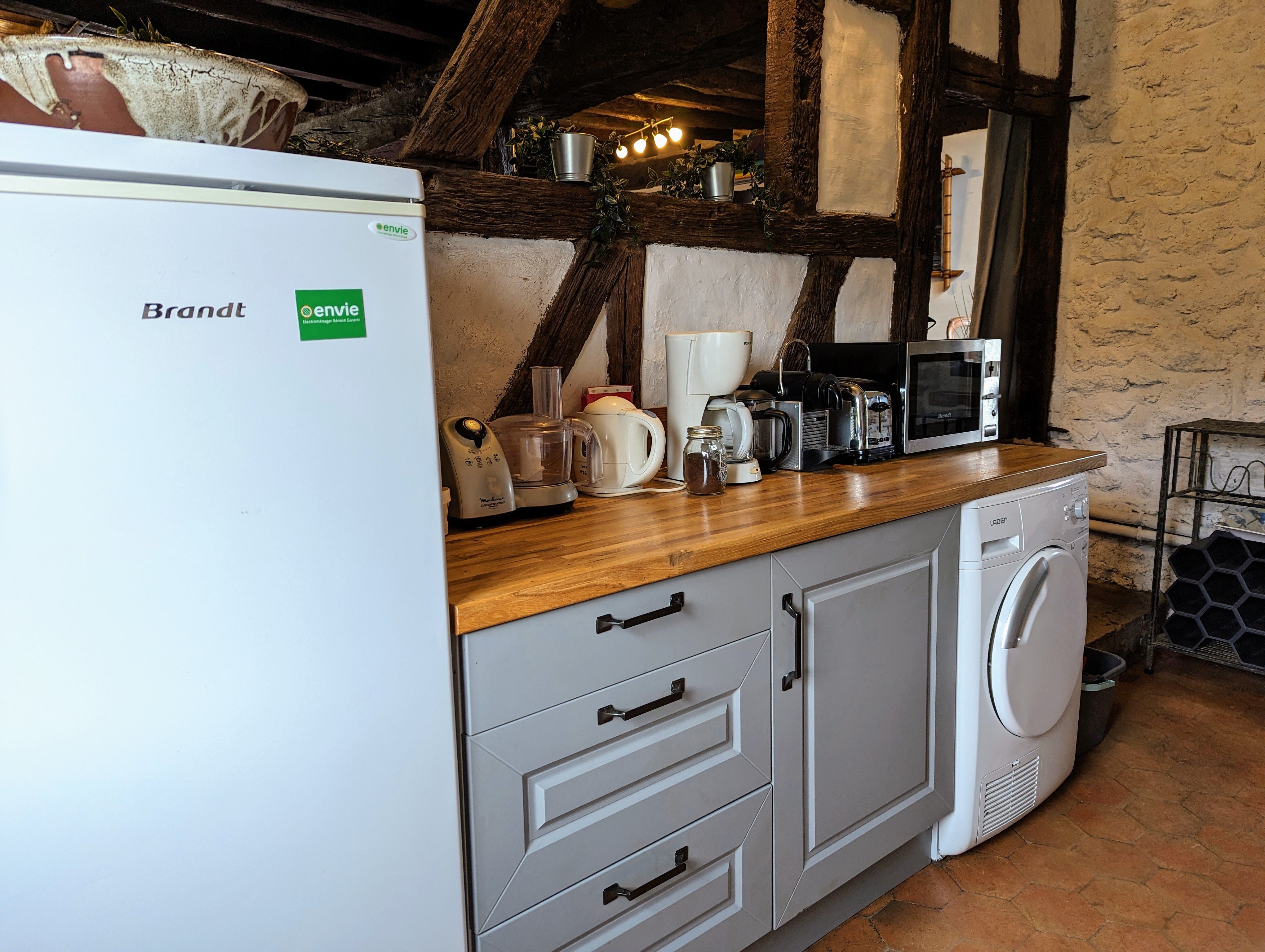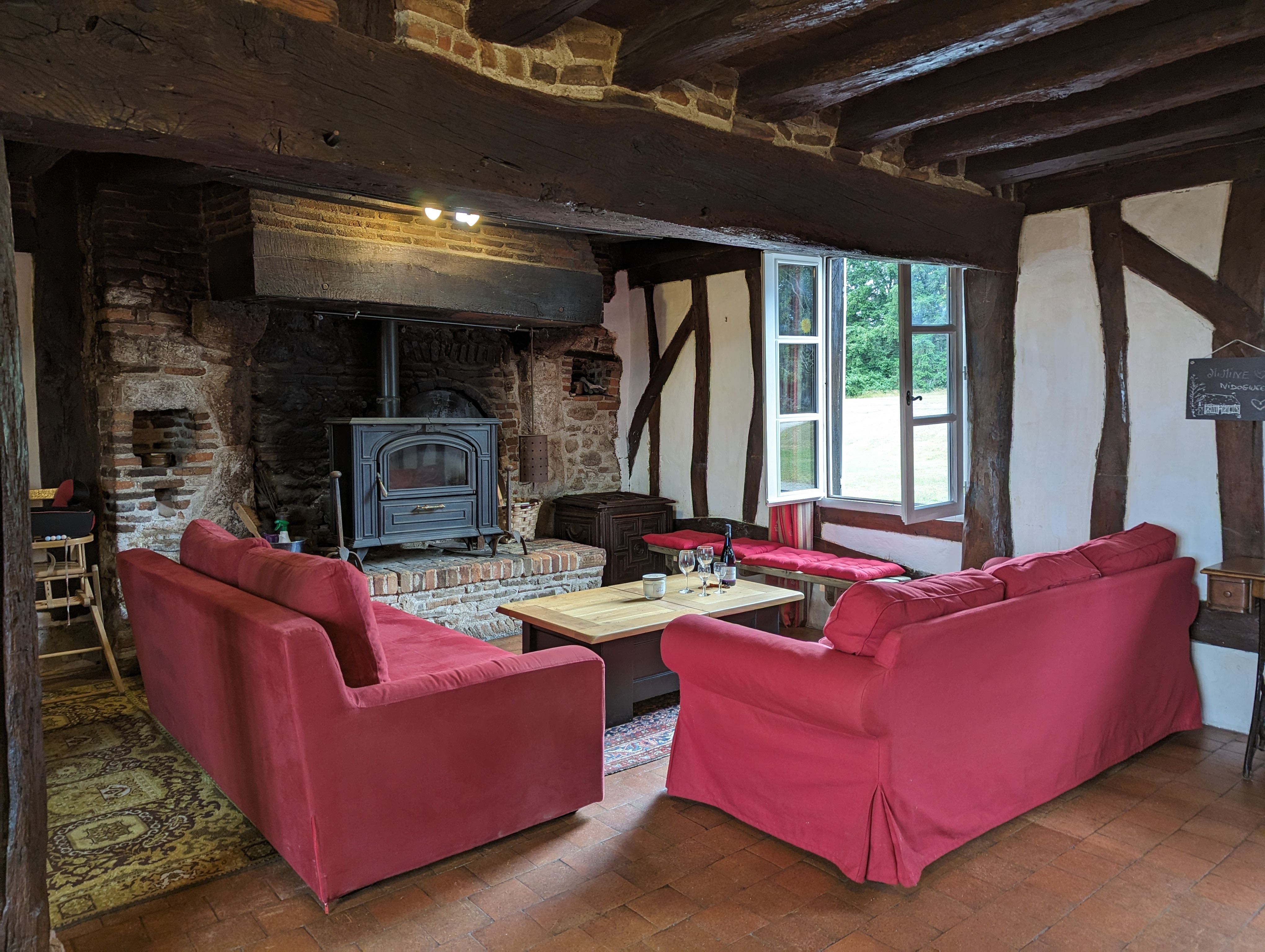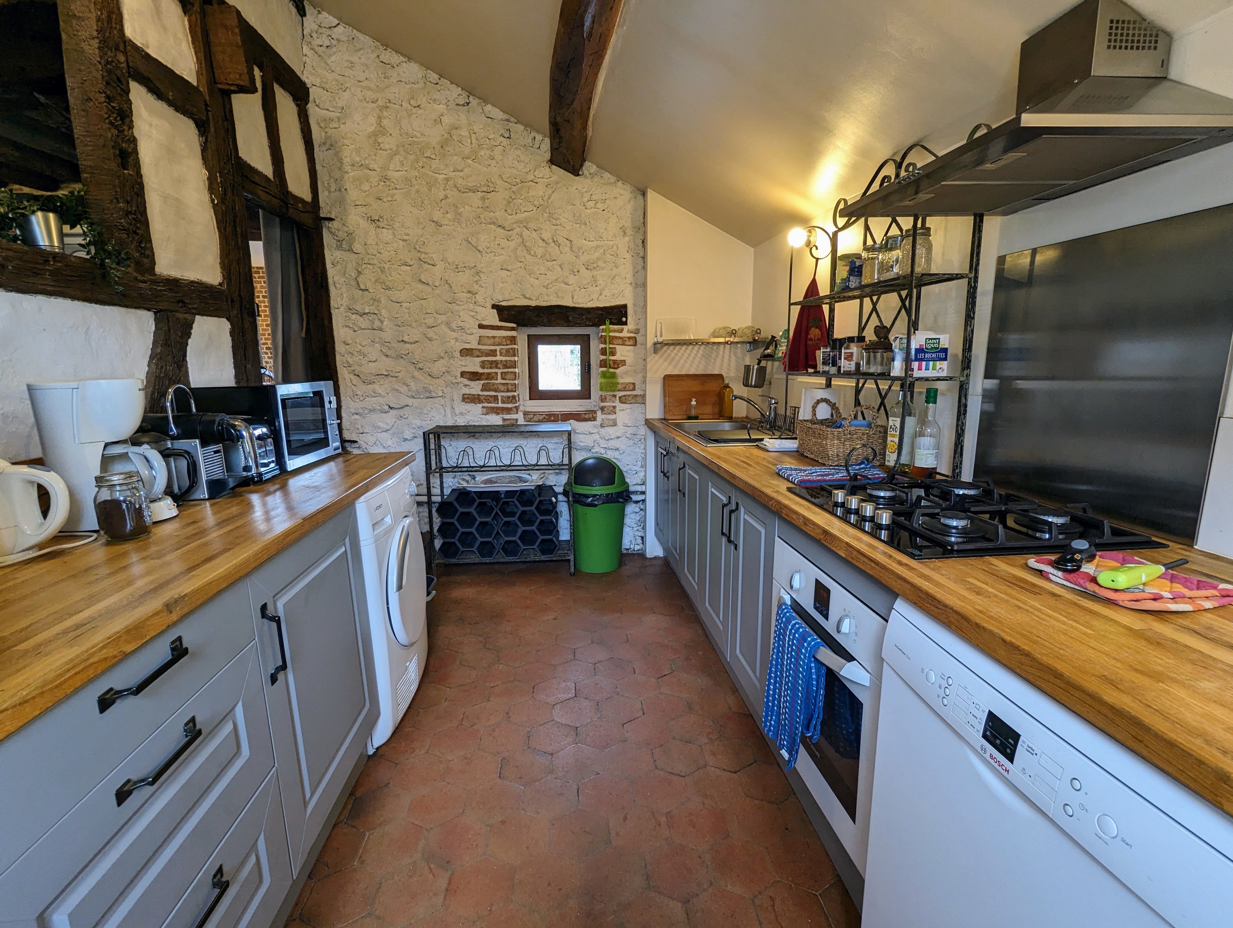 – Une grande pièce à vivre avec espace salon et son poêle à bois, salle à manger et cuisine toute équipée ouverte (Réfrigérateur avec petit compartiment congélateur, plaque de cuisson gaz (4 feux), four, micro-ondes, lave-vaisselle, lave-linge, sèche-linge). Le salon vous offrira des soirées au coin du feu.