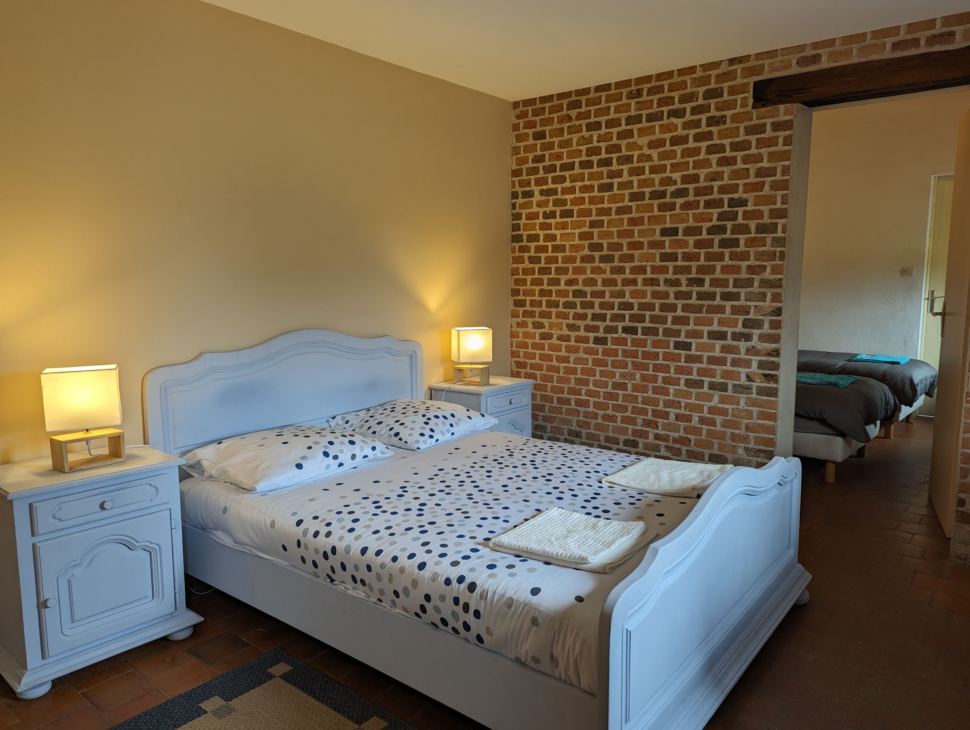 – Une première partie avec en enfilade : Chambre n°1 passante (1 lit de 140×190), Chambre n°2 communicante (1 lit de 140×190) et Salle d’eau n°1 attenante (douche italienne, meuble lavabo, WC),